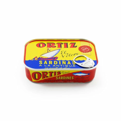 Enjoy sardines a la antigua in olive oil straight from the tin. Ortiz pick the freshest sardines from auctions on the north coast of Spain, then carefully clean and prepare them by hand. The sardines are quickly fried in virgin olive oil, before being tinned with olive oil and a little salt. Try lightly toasting slices of fresh, crusty bread, top with crushed tomatoes and garlic, and finally place a single sardine on top. Enjoy as a starter or snack.
