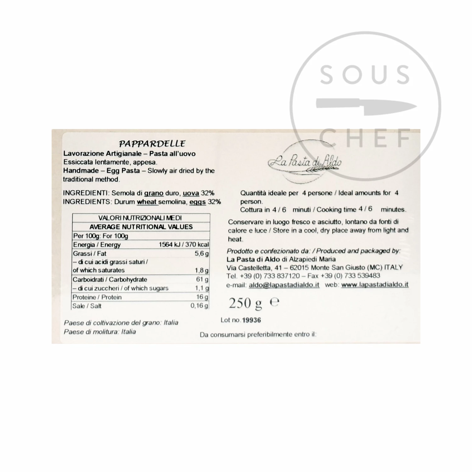 Pasta di Aldo pappardelle egg pasta has a rich and refined flavour – this is one pasta you won’t want to smother with sauce! Serve the wide ribbons simply with a little butter or high quality olive oil and black pepper, to let the flavour of the pasta shine through.