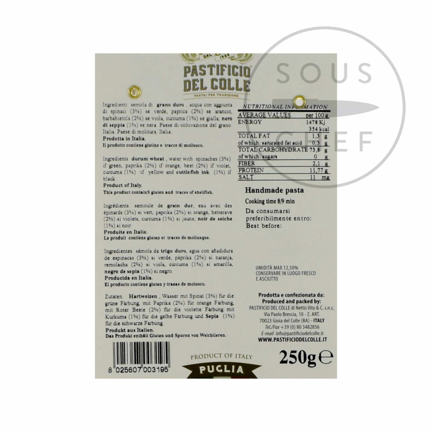 Ingredients: Durum wheat semolina, water, spinach (3%), paprika (2%), beetroot (2%), turmeric (1%), cuttlefish ink (1%)