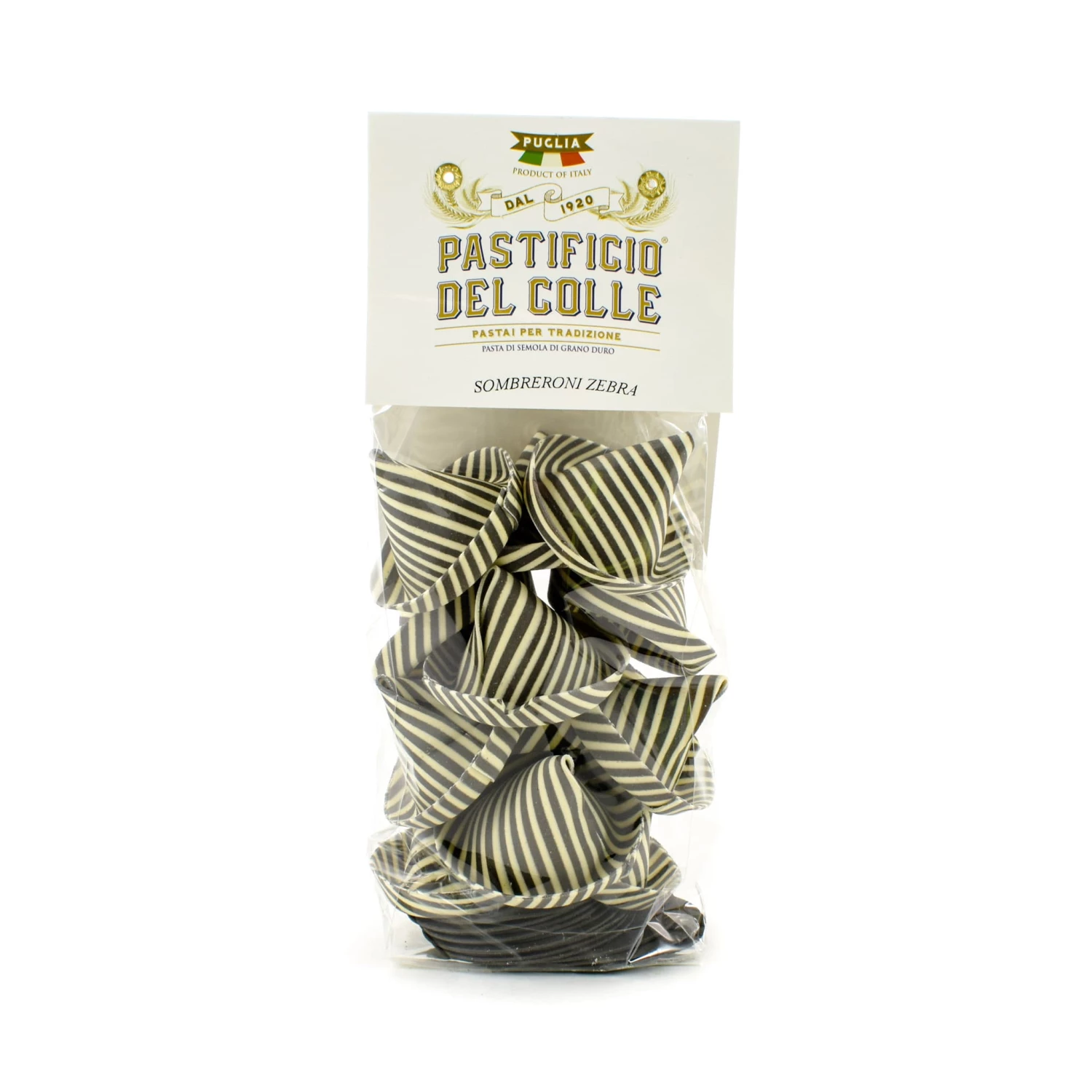 Pastificio Del Colle’s squid ink striped sombreroni are shaped like little Mexican hats, hence their name! Sombreroni are the perfect shape for stuffing (thanks to the round little bottom) and collect sauce brilliantly in the ‘hat’ rims – fill with creamy ricotta and spinach, seal up, bake in a rich tomato sauce then tuck in!