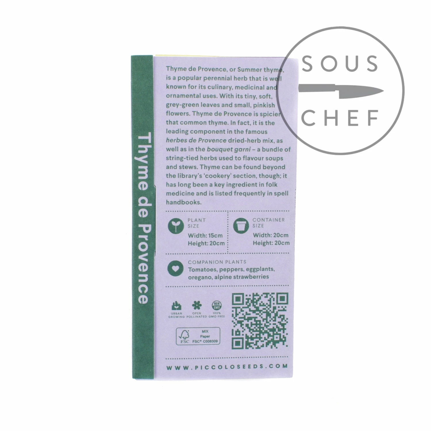 Thyme de Provence seeds love the sunshine, so will be really happy on a sun-drenched window in your kitchen. The thyme has soft grey-green leaves and small pink flowers, and is used widely in French and Mediterranean cooking.