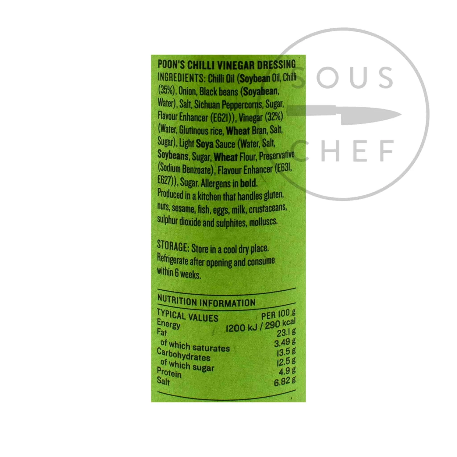 Ingredients: Chilli Oil (Soybean Oil, Chilli (35%), Onion, Black beans (Soyabean, Water), Salt, Sichuan Peppercorns, Sugar, Flavour Enhancer (E621)), Vinegar (32%) (Water, Glutinous rice, Wheat Bran, Salt, Sugar) Light Soya Sauce (Water, Salt, Soybeans, Sugar, Wheat Flour, Preservative (Sodium Benzoate), Flavour Enhancer (E631, E627), Sugar.