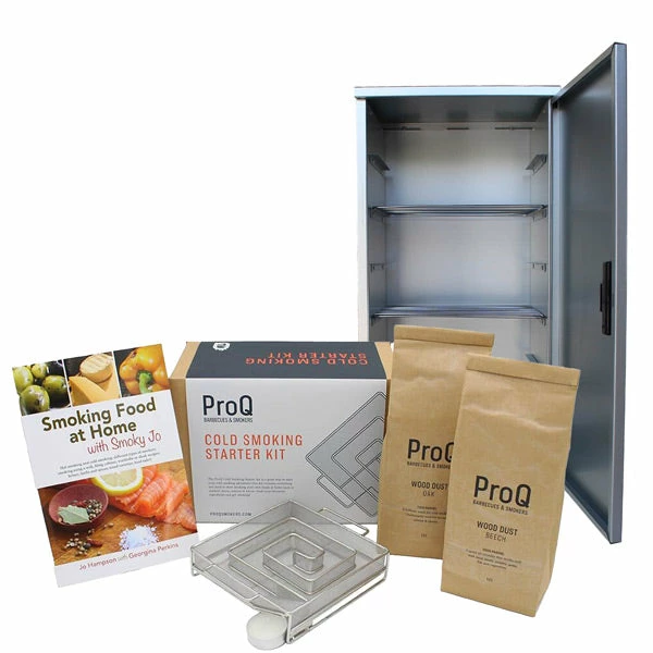 - ProQ Cold Smoking Cabinet – with shelving and space for hooks. This spacious chamber contains all the smoke while you create your signature smoked ingredients. Made from galvanised steel, it is lightweight, durable and weatherproof. Has enough space to smoke 2-3kg of cheese, or hang several whole sides of salmon.