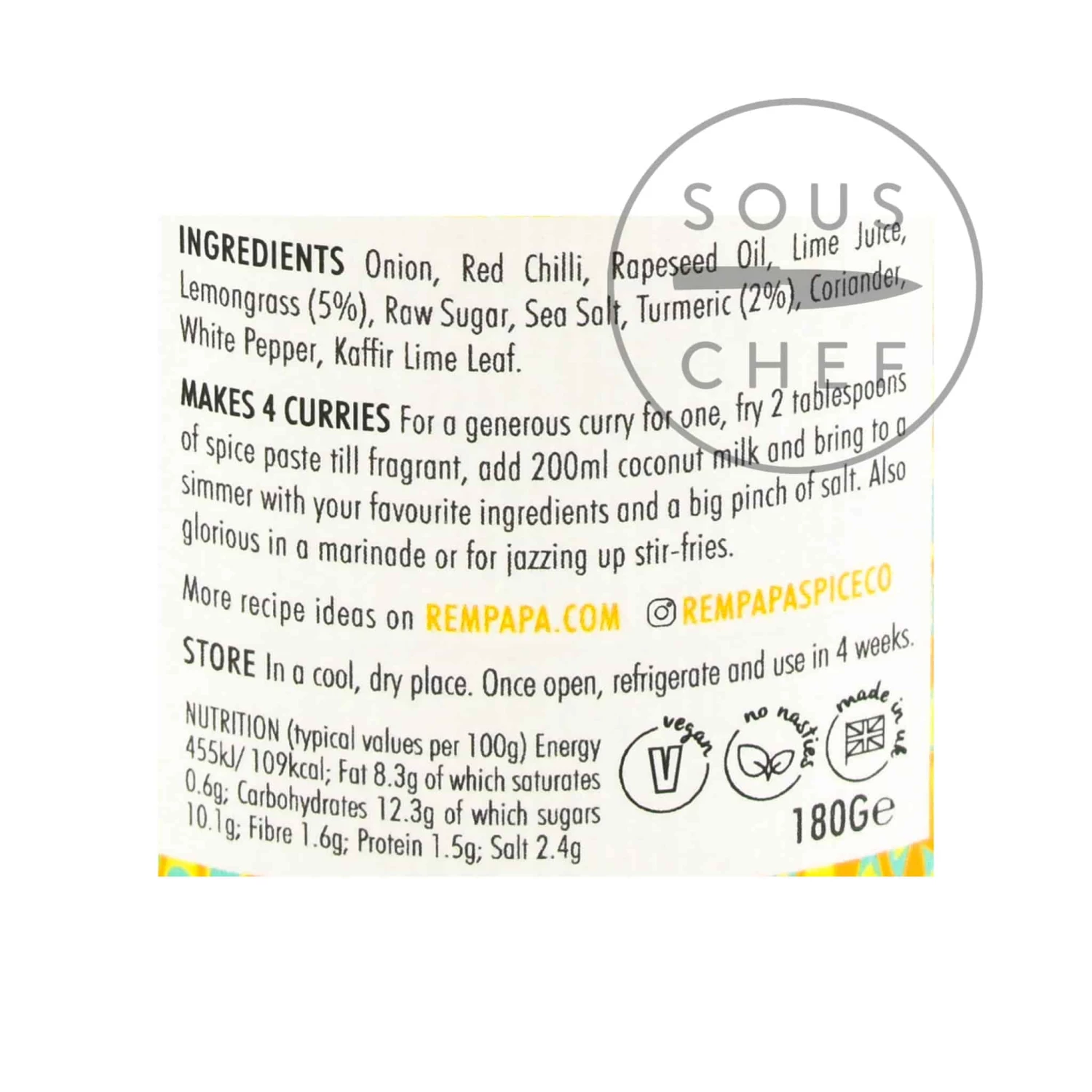 Ingredients: Onion, Red Chilli, Rapeseed Oil, Lime Juice, Lemongrass (5%), Raw Sugar, Sea Salt, Turmeric (2%), Coriander, White Pepper, Kaffir Lime Leaf.