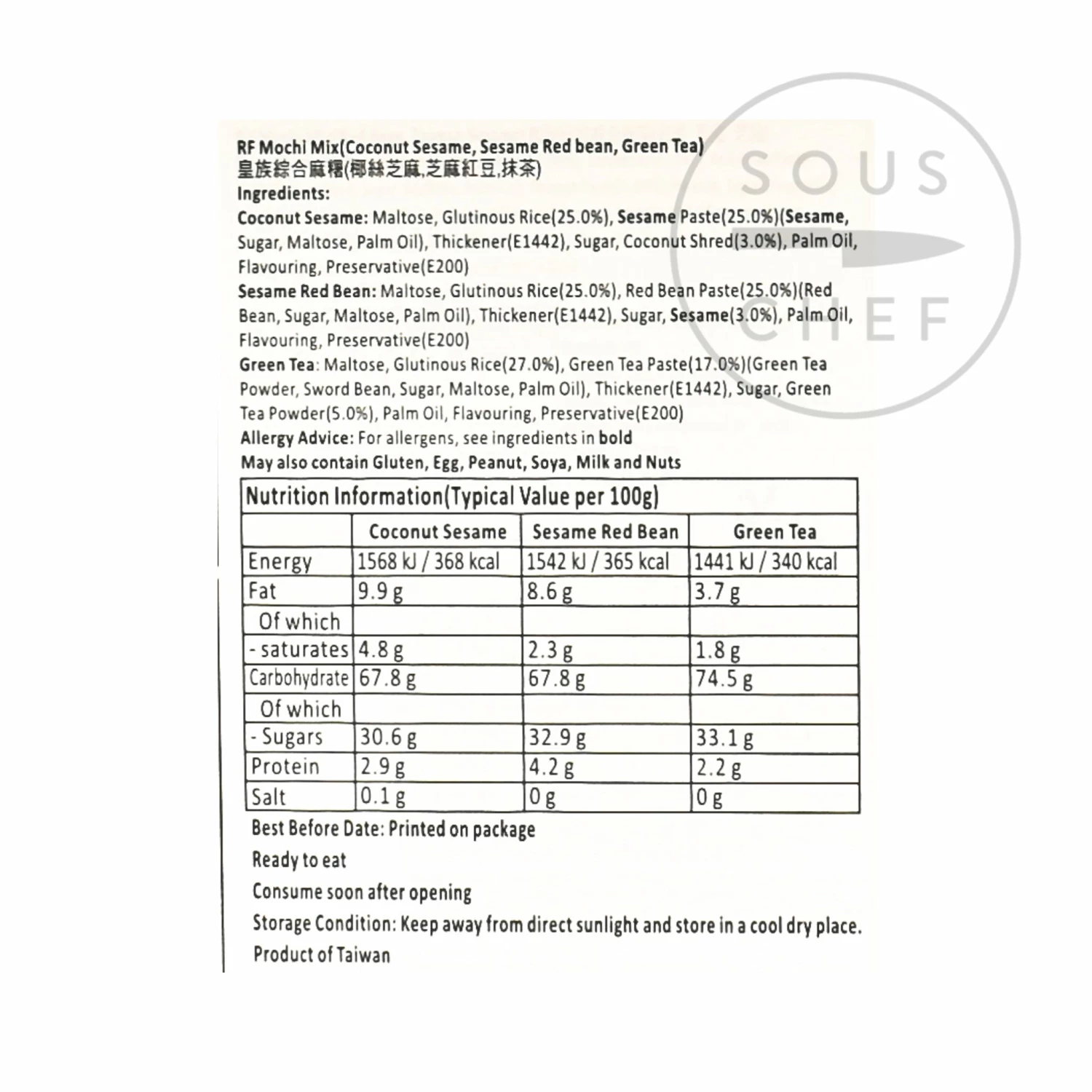 Ingredients: maltose, glutinous rice (25%), sugar, thickening agent (E1442), sesame paste (5.5%) (sesame, sugar, maltose, palm oil), red bean paste (5.5%) (red bean, sugar, maltose, palm oil), green tea paste (5.5%) (green tea powder, sword bean, sugar, maltose, palm oil), coconut (3.25%), sesame (3.25%), palm oil, green tea powder (2.5%), flavouring, preservative (E200). Allergens are listed in bold.