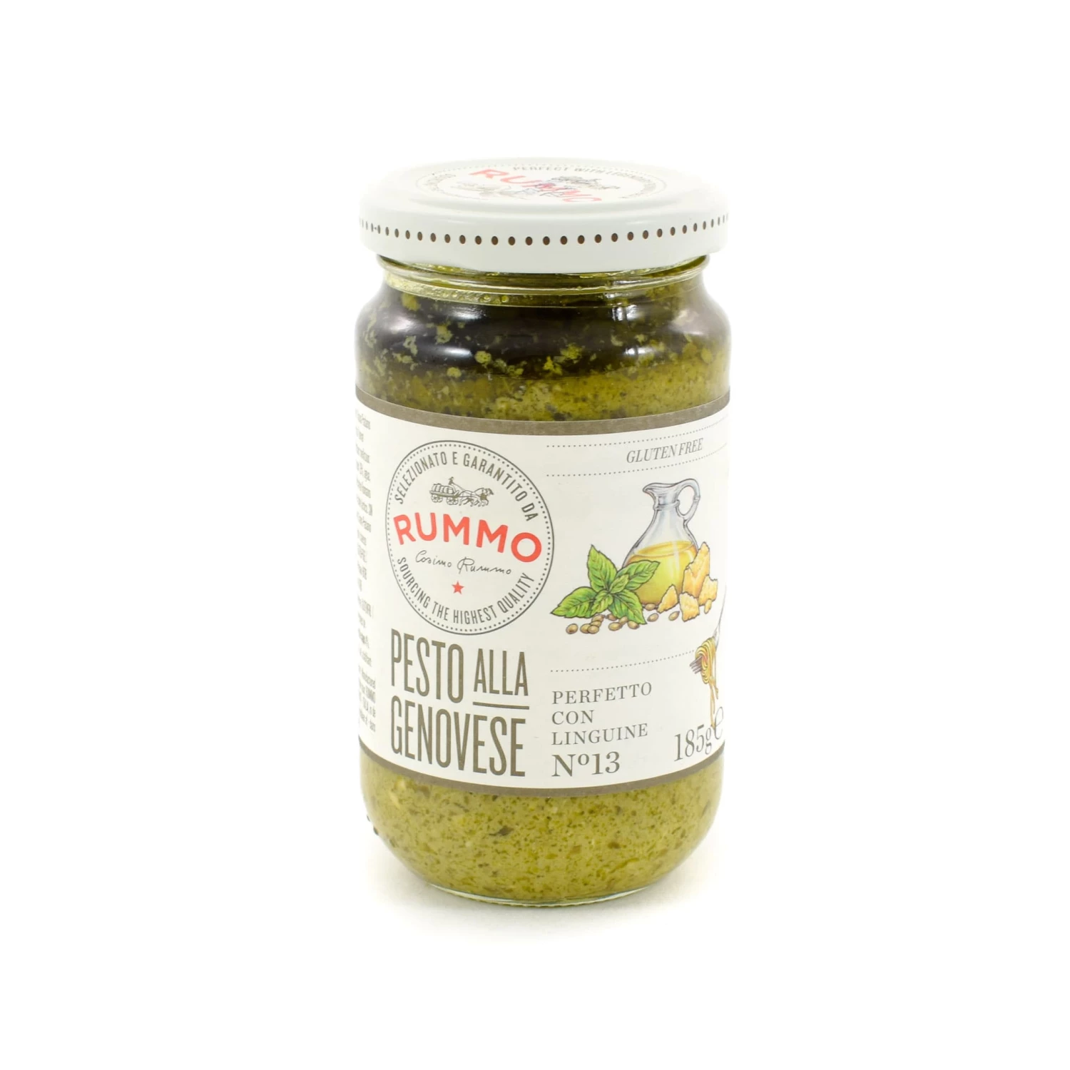 Rummo’s basil pesto is a traditional recipe of Grana Padano and Pecorino Romano cheese blended with basil, enriched with cashews and pine nuts. Use it to make Ligurian classic pasta alla Genovese, simply tossing spaghetti through the pesto before serving.