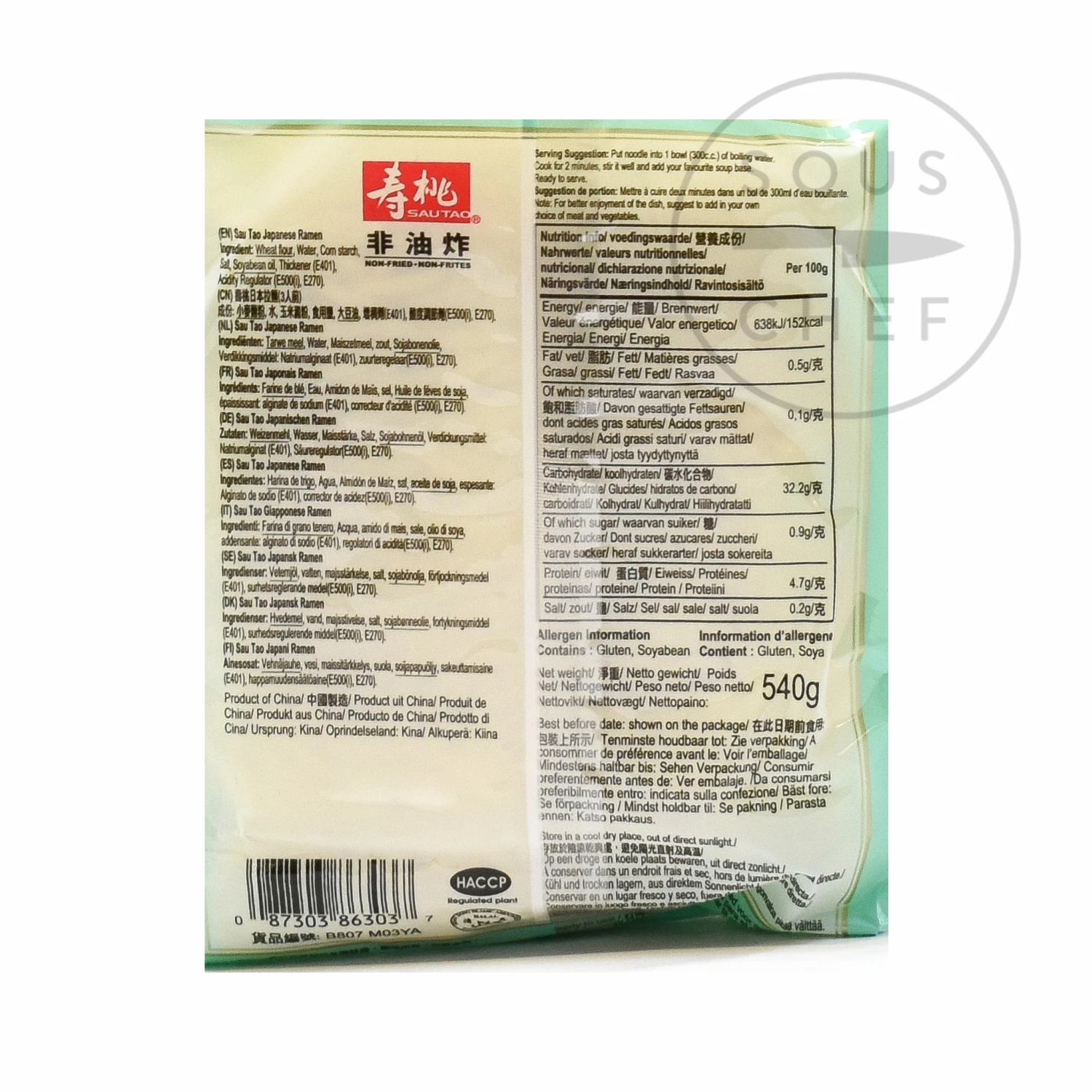 Ingredients: Water, wheat flour, tapioca starch, salt, soybean oil, thickener (sodium alginate E401), acidity regulator (sodium hydrogen carbonate E500ii), acidity regulator (Lactic acid (L-, D- and DL-) E325), colour (gardenia yellow E164) Contains gluten, soya, wheat.