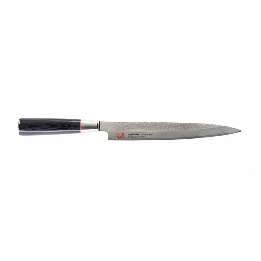 Anyone serious about sushi and sashimi should own this Senzo 33 layer sashimi knife. Also known as a yanagiba or ‘willow blade’ knife, the sashimi blade is much longer than most Western knives. This is for the express purpose of slicing sashimi with one single cut, as sawing backwards and forwards can leave unsightly marks in the surface of your fish. It also makes it much harder to keep your slices of an even thickness, so one long, smooth motion is much to be preferred. And for that, you need an extra-long sashimi knife.