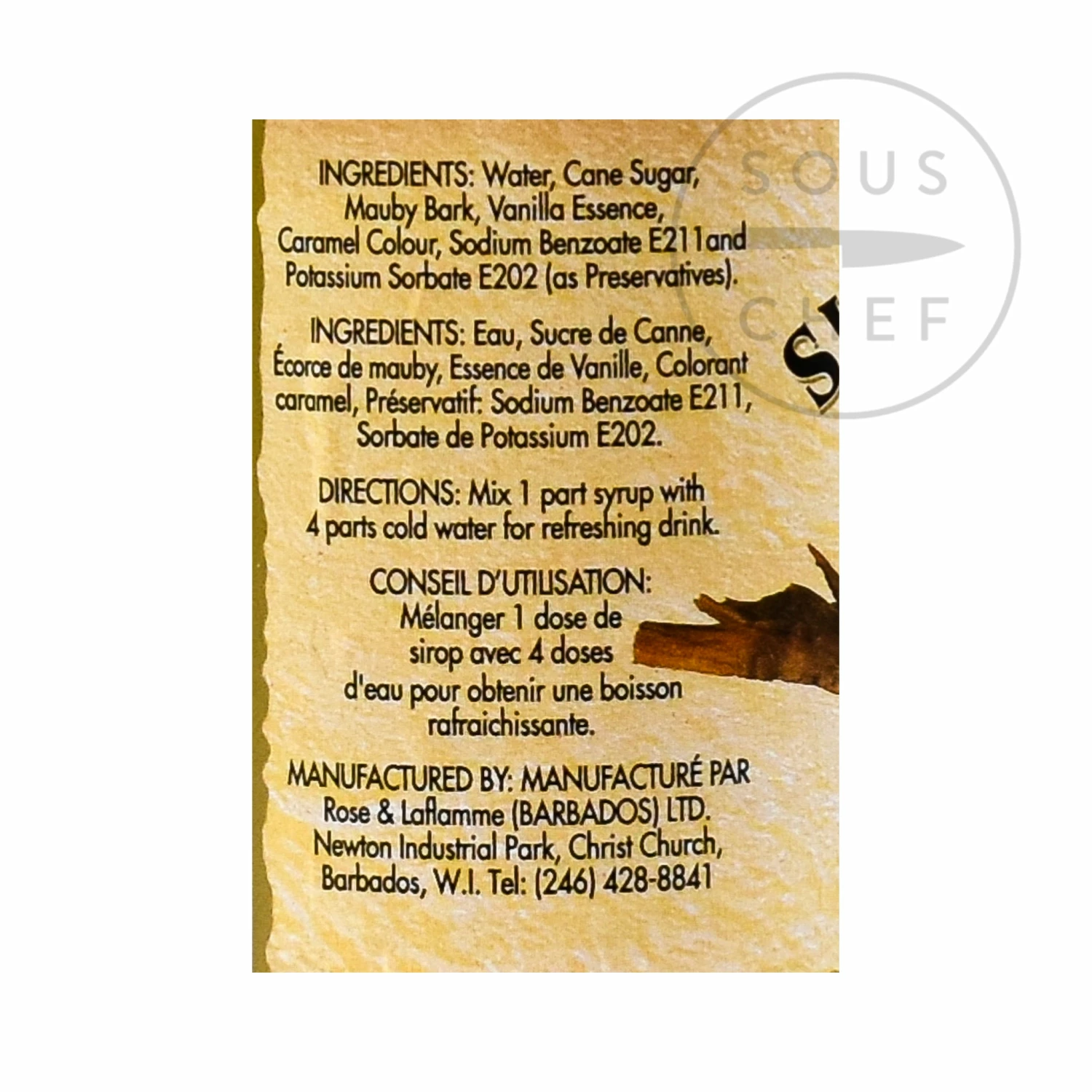 Ingredients: Water, cane sugar, mauby bark, vanilla essence, caramel colour, sodium benzoate E211 and potassium sorbate E202 (preservatives).