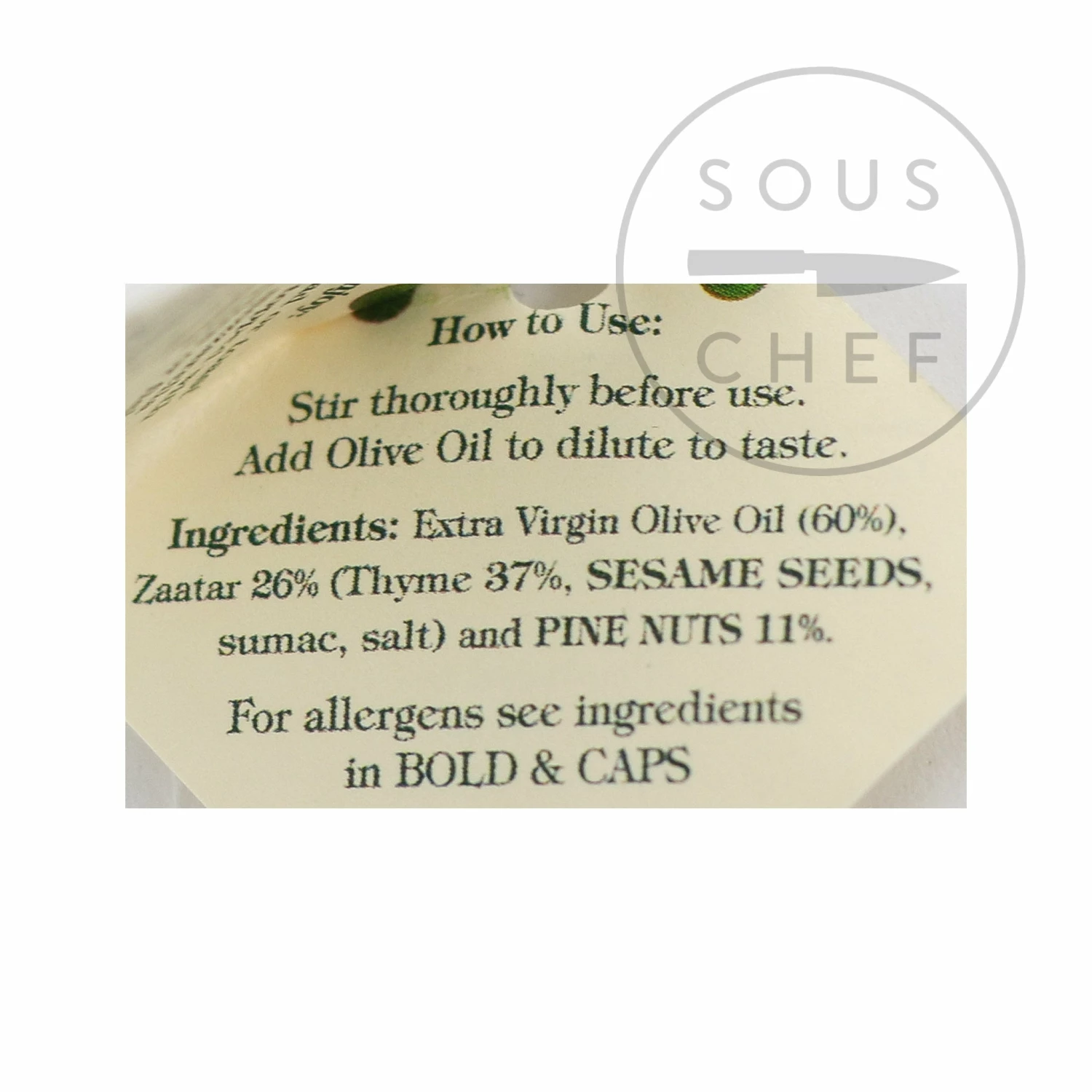Ingredients: extra virgin olive oil (60%), zaatar 26% [thyme 37%, sesame seeds, sumac, salt], and pine nuts 11%.