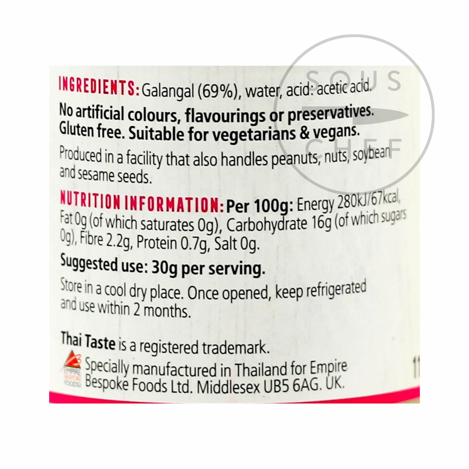 Ingredients: galangal (69%), water, acetic acid. Produced in a facility that also handles peanuts, nuts, soybean and sesame seeds.