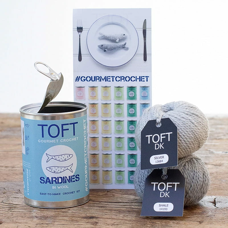 Toft sardines in a tin gourmet crochet kit is a crafty gift for seafood lovers. Each tin comes with yarn and an easy-to-follow pattern for making 10 crocheted sardines.