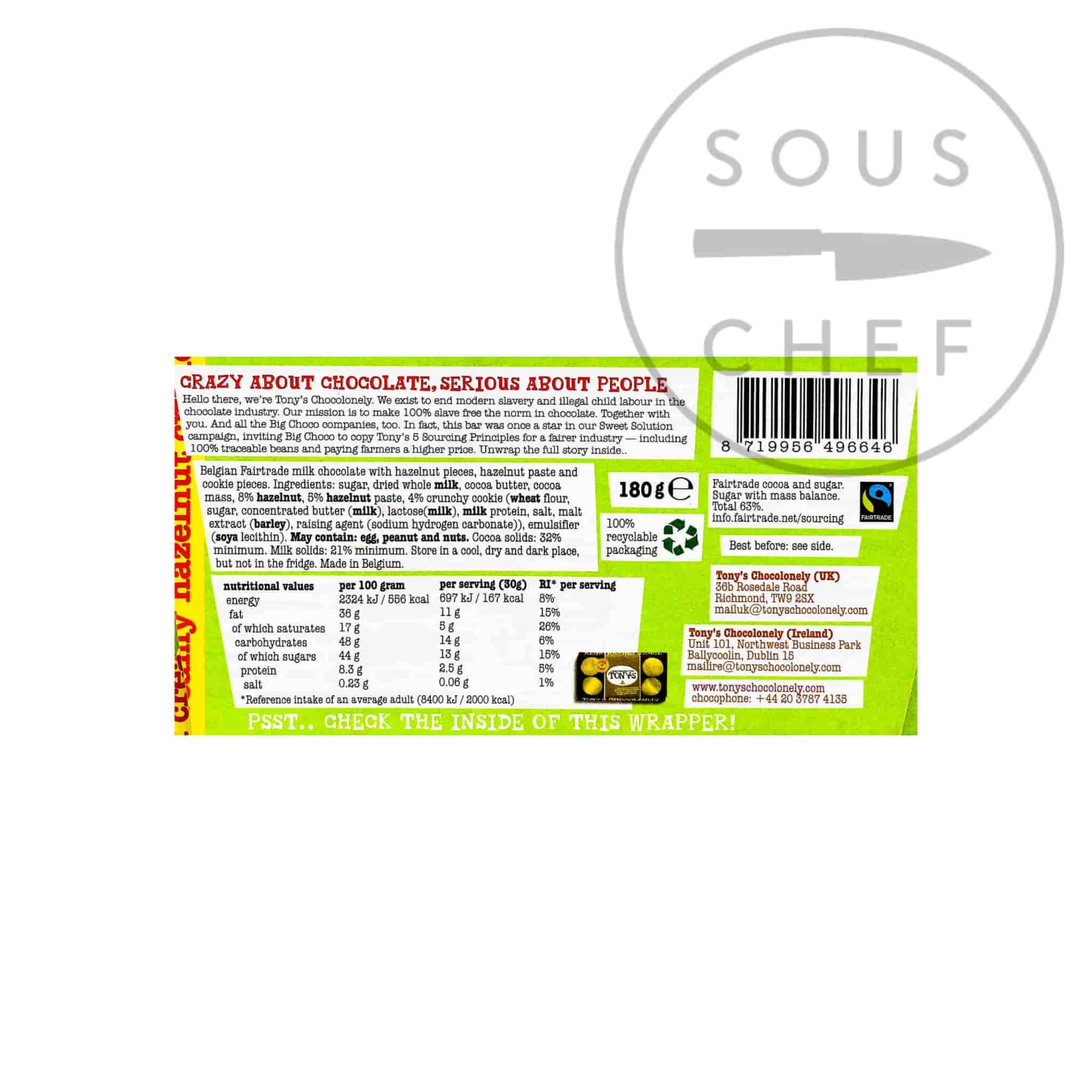 Tony’s Chocolonely milk creamy hazelnut crunch is a bar for nut lovers! With a nod to a Ferrero Rocher, smooth Belgian milk chocolate is paired with finely chopped hazelnuts, hazelnut paste and pieces of feuilletine biscuit.