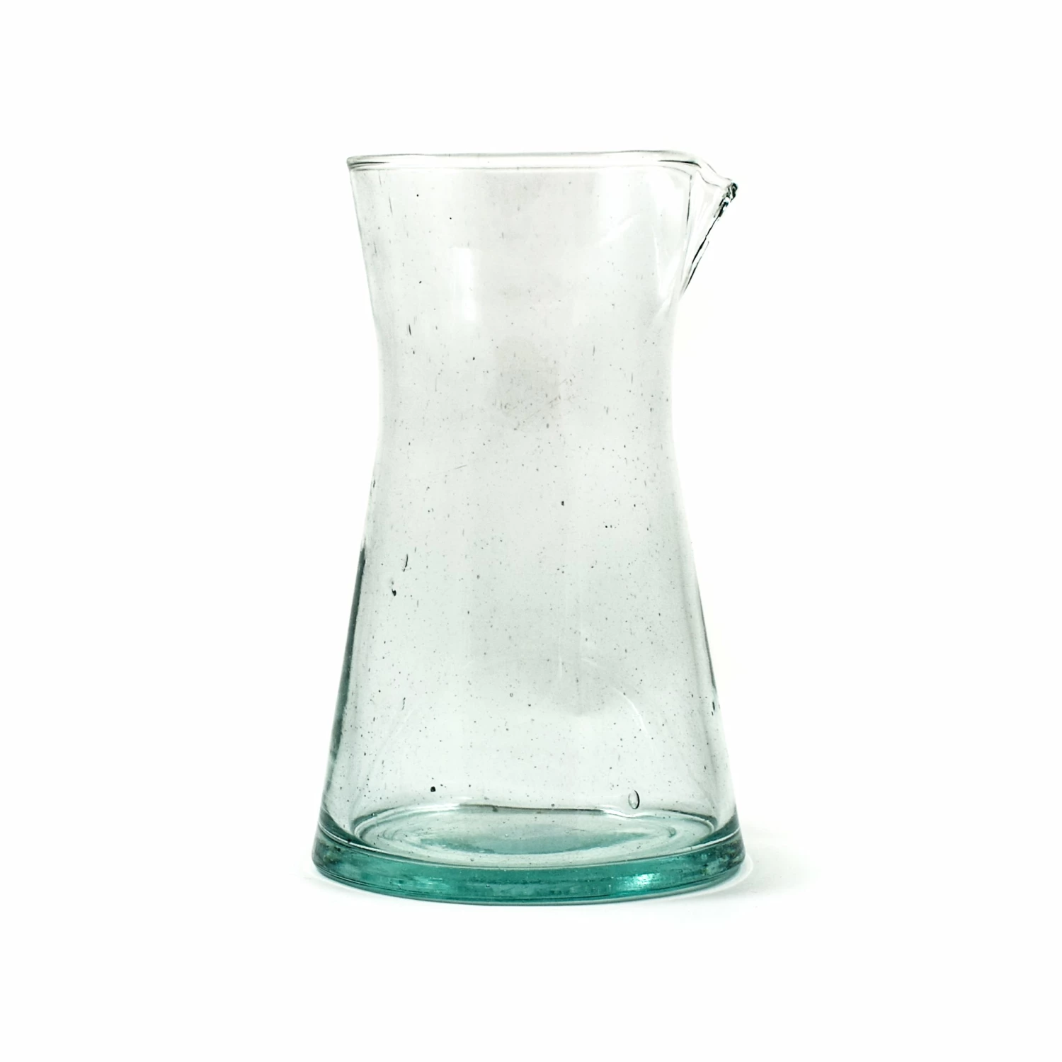The carafe is made from recycled glass bottles and other waste glass. It is made in Le Verre Beldi factory in Morocco, the last surviving Moroccan glass factory to still use traditional glass blowing methods.