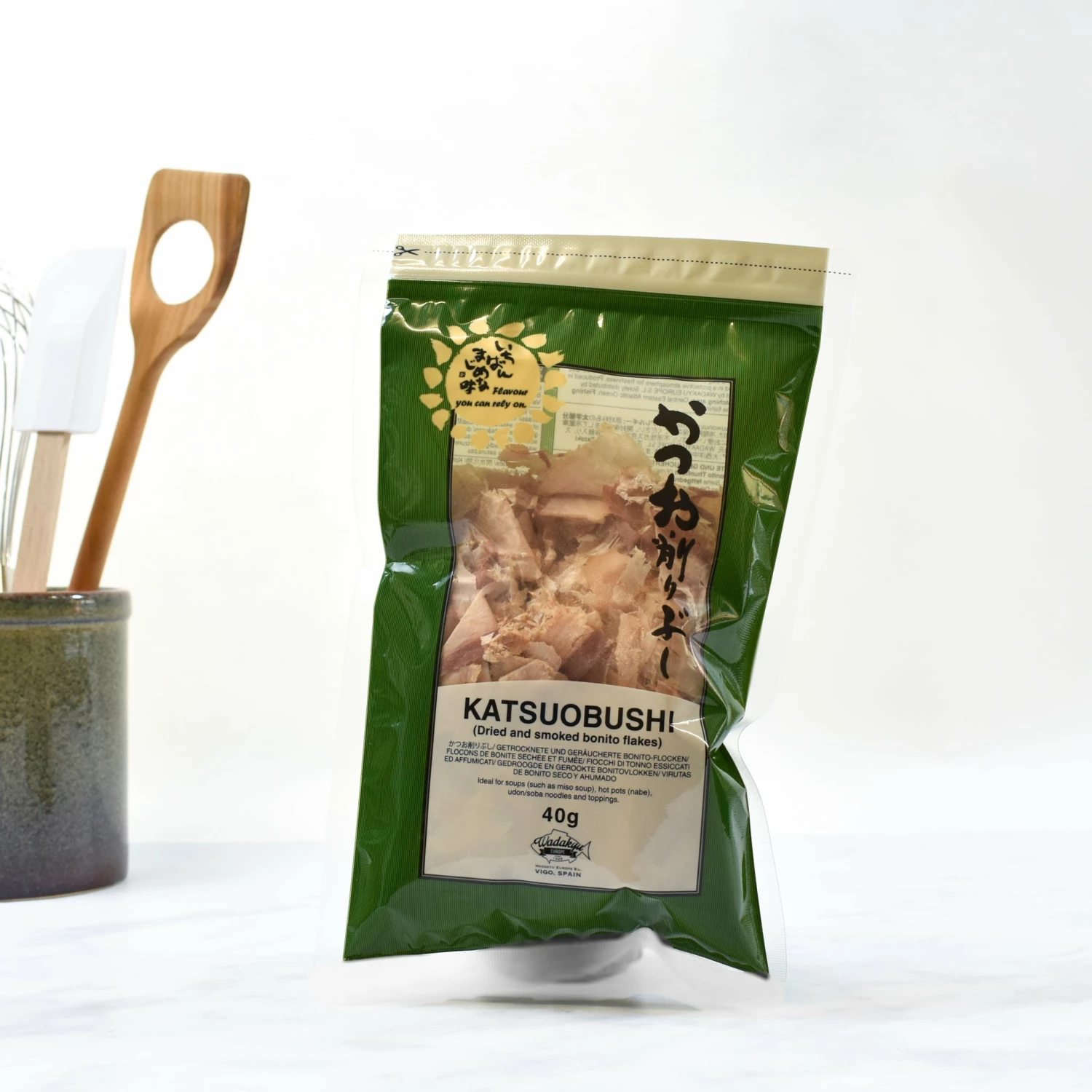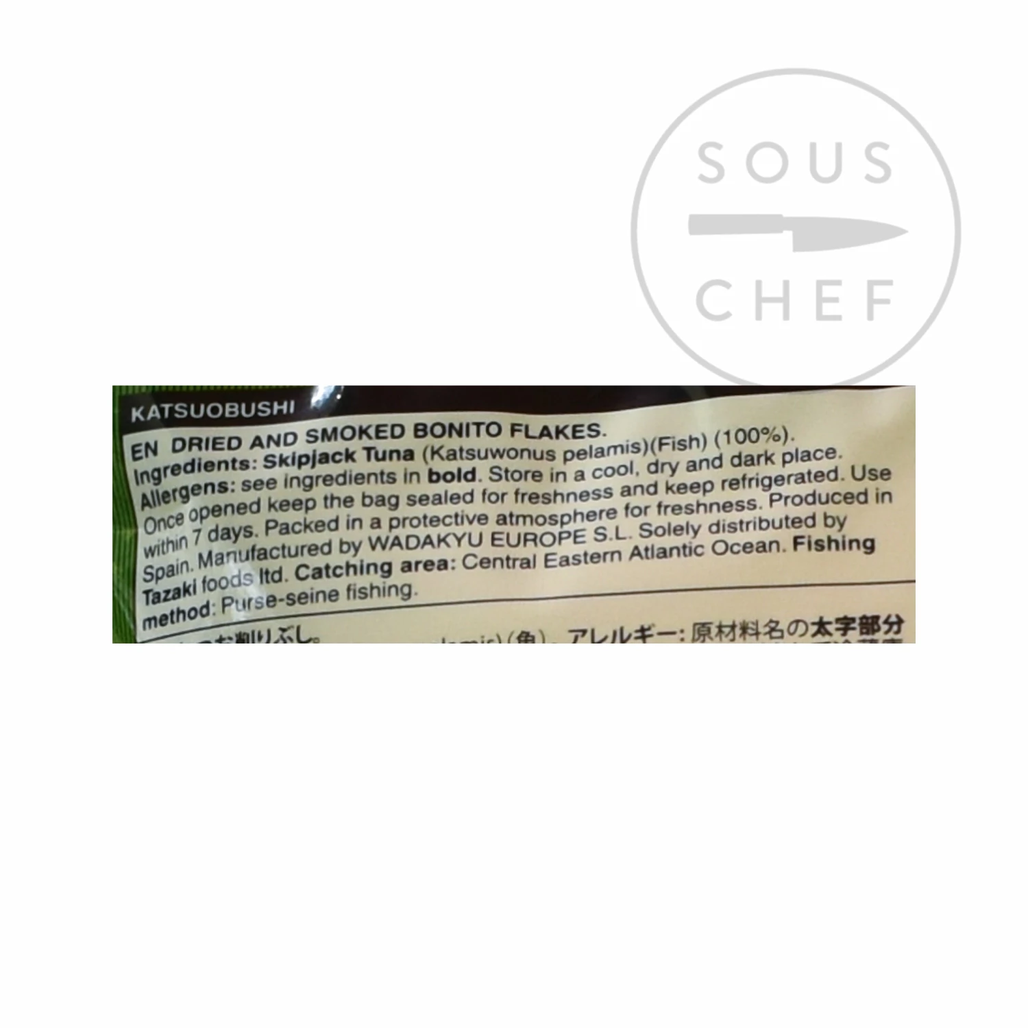 Katsuo Bushi bonito flakes, or katsuobushi, are tissue-paper thin fish shavings with intense umami flavours. They come from a tuna-like Pacific fish which is dried, fermented to wood-like hardness and then smoked. Use along with dried kelp to form the base of the Japanese stock dashi.