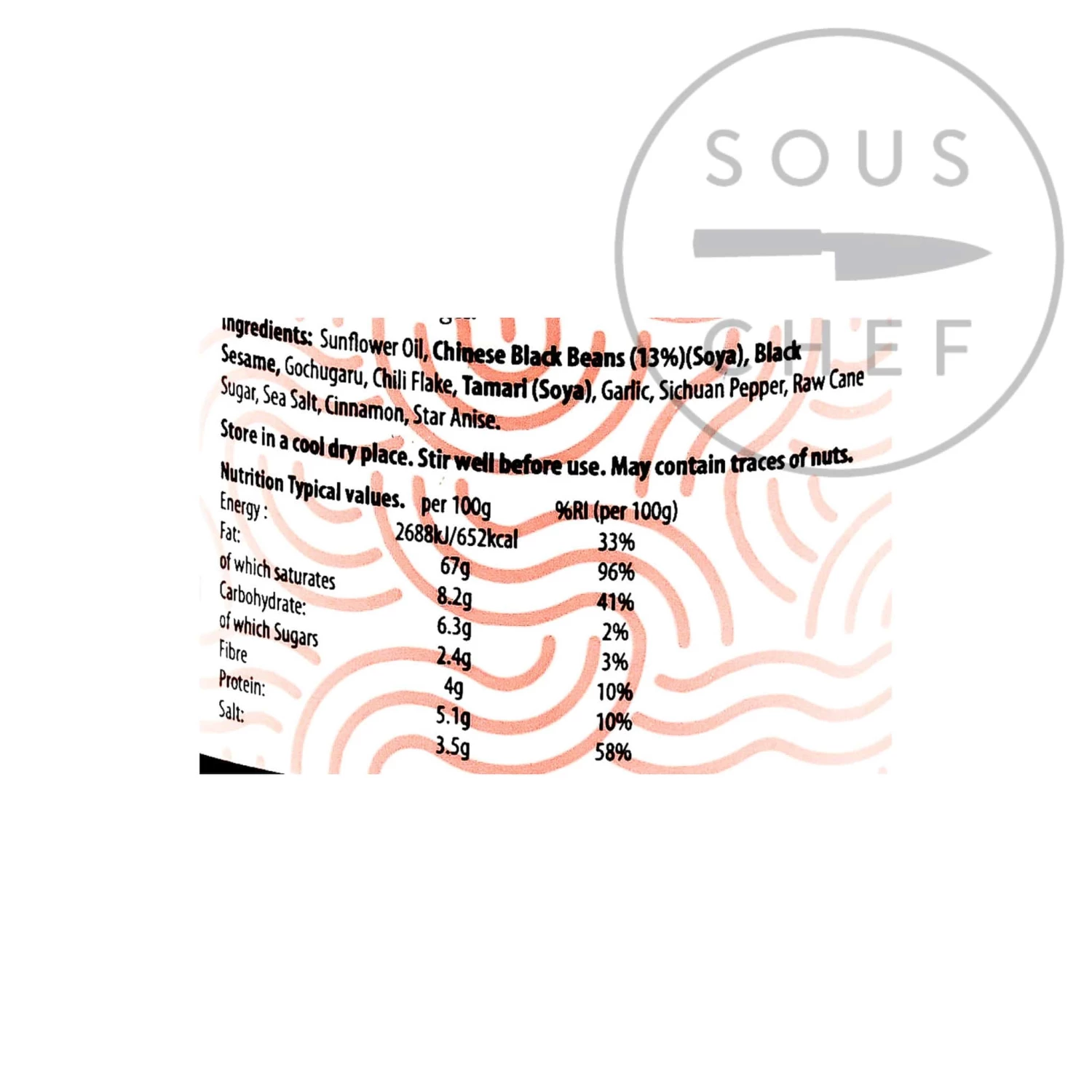 Ingredients: Sunflower oil, Chinese black beans (13%)(soya), black sesame, gochugaru, chilli flake, tamari (soya), garlic, sichuan pepper, raw cane sugar, sea salt, cinnamon, star anise.