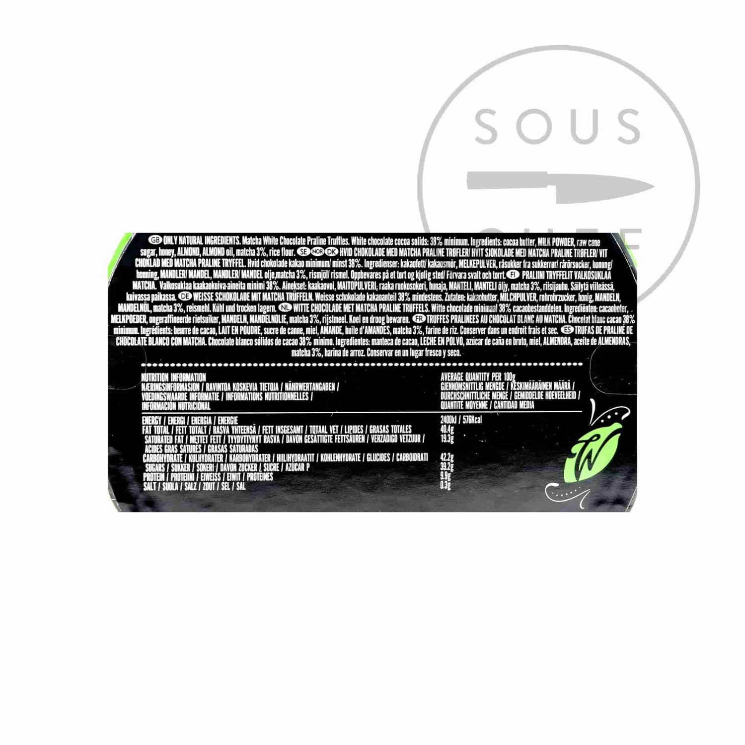 Ingredients: Cocoa butter, milk powder, raw cane sugar, honey, almond, almond oil, matcha 3%, rice flour, glucose. White chocolate cocoa solids: 38% minimum.