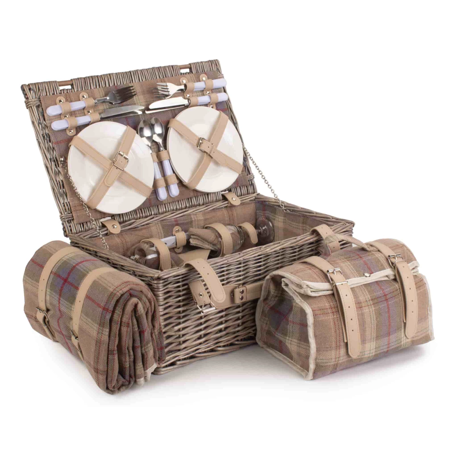 Use the lavender tartan picnic hamper for four to feast al fresco all summer – just add the food! Crafted from willow, this traditional picnic hamper has smart cream faux leather straps and a lavender tartan lining. Plus, the side handle makes this hamper easy to carry, whether you’re travelling by car, train or on foot.