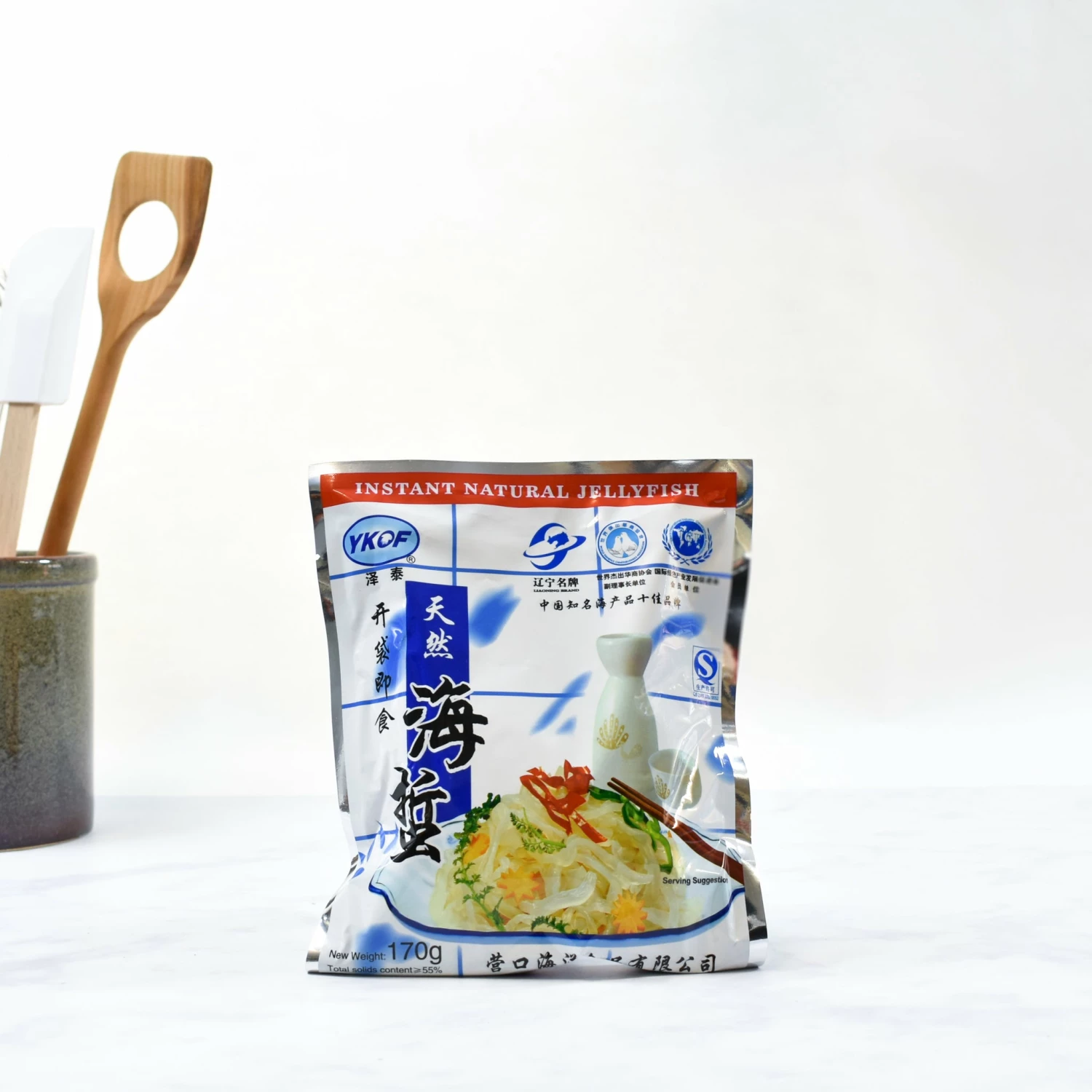 Ingredients: jellyfish (55%), brine (water, salt.) Seasoning pack: rapeseed oil, salt, sugar, pepper, spring onion, citric acid, preservative E202.