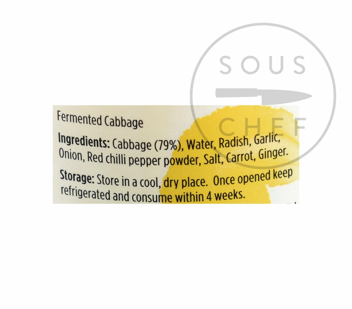 Ingredients: Cabbage (79%), water, radish, garlic, onion, red chilli pepper powder, salt, carrot, ginger